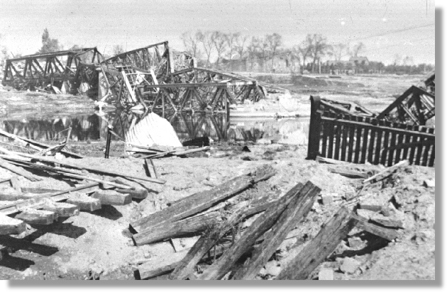 Verwoeste Maasbruggen vanaf Venlose oever.