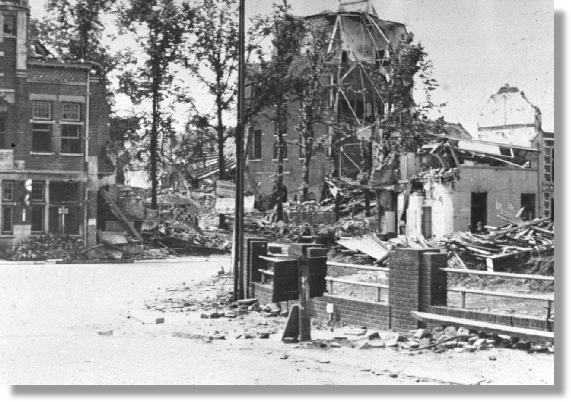 Links het begin van de Vleesstraat. Op de voorgrond rechts muurtjes, die de grens aangaven van de Infanterie kazerne.