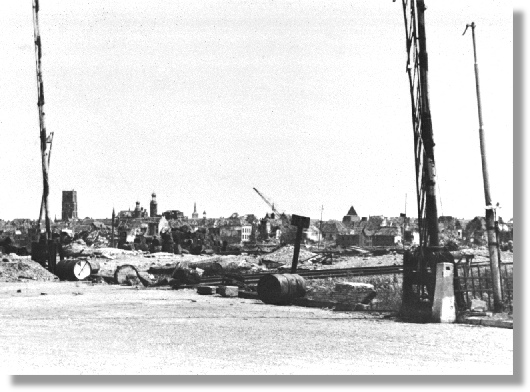 Links de uitgebrande Martinustoren, dan torentje Joriskerk. Helemaal rechts de Nedinscotoren.