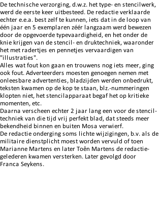 ln arren moede verzorgde uiteindelijk Jan Evers als secretaris van de vereniging een bij tijd en wijle verschijnend clubblad. Dit werd een traditie die door zijn opvolger, Wiel Evers, met veel élan werd overgenomen, maar over onze huidige secretaris bericht al een ander Mosa-iek-steentje van dit boekwerk.